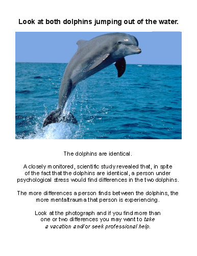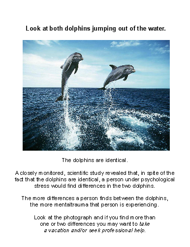 A closely monitored, scientific study revealed that, in spite of the fact that the dolphins are identical, a person under psychological stress would find differences in the two dolphins.