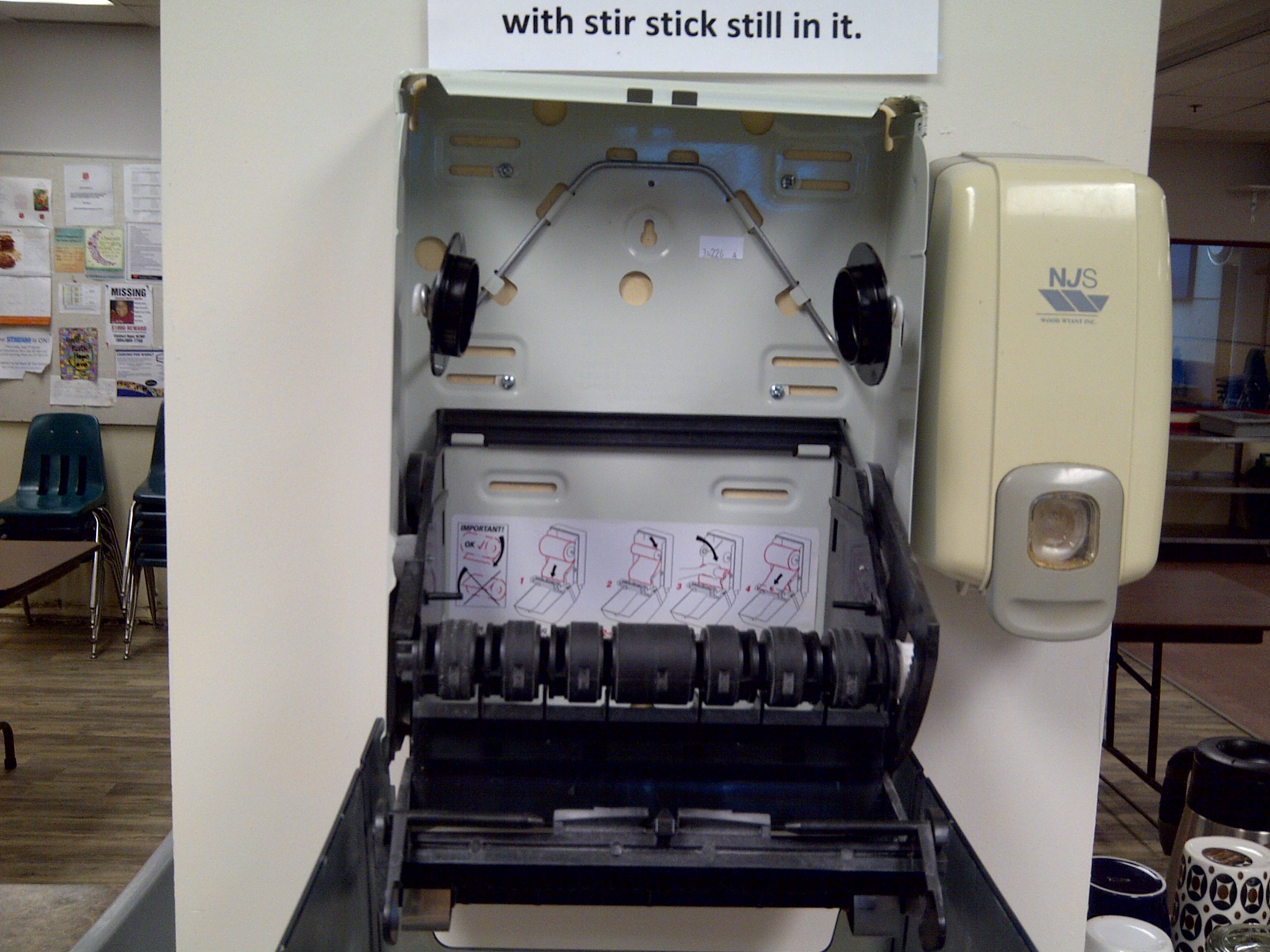 If you remove the roll you find, immediately behind the roll the instructions on how to put a new roll of towelling into the dispenser.